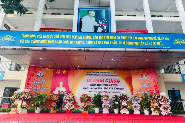Lãnh đạo xã Yên Viên tặng hoa và quà nhà trường nhân dịp Lễ khai giảng năm học 2024-2025