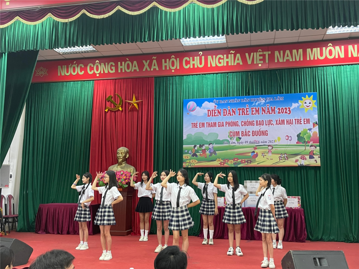 Các em HS trong đội văn nghệ của trường THCS Yên Viên tham gia tiết mục văn nghệ tại Diễn đàn trẻ em năm 2023